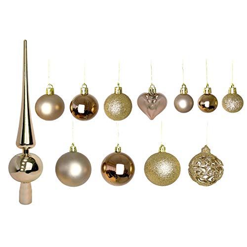 De set bevat een boomtop en in totaal vijf verschillende soorten kerstballen. De klassieke kerstballen zijn verdeeld over drie soorten met mat, glanzend en glinsterend design, met een diameter van ca. Ø 3/4/6 cm. Een extra soort met een diameter van ca. Ø 6 cm heeft een uitgesproken glinsterend design. Tot slot bevat de set nog vier kerstballen in hartvorm, met een afmeting van ca. 4 cm. Voor elke bal is natuurlijk de bijpassende hanger inbegrepen.