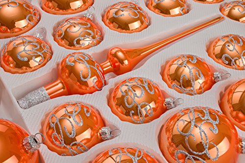 39-delige Kerstballenset in “hoogglans-oranje-zilveren ornament”. Elke bal is met veel moeite en geduld met de hand gemaakt. Mondgeblazen en stijlvol versierd. Het hele decor is niet in woorden te nemen. Bekijk gewoon de foto’s en dompel je onder in een prachtige kerstsfeer. We hebben nog andere kerstboomversieringen met dezelfde decoratie of stel gewoon wat moois samen. De diameter van de afzonderlijke ballen bedraagt ca. 4-8 cm. Bij deze set hebben wij ook bijpassende glazen vogels met echte veren, glazen dennenappels en 12-delig. Bestel meteen de kerstbalhaken mee!