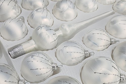 39-delige Kerstballenset in “ijswit zilver” regen Elke bal is met veel moeite en geduld met de hand gemaakt. Mondgeblazen en stijlvol versierd. Het hele decor kan niet in woorden worden opgenomen. Bekijk gewoon de foto’s en dompel je in een prachtige kerstsfeer. We hebben nog andere kerstboomversieringen waarin hetzelfde decor is opgenomen of gewoon wat mooi samenstelt. De diameter van de afzonderlijke ballen bedraagt ca. 4-8 cm. Bij deze set hebben wij ook bijpassende glazen vogels met echte veren, glazen kegels en 12-delig. Set Bestel toch meteen de kerstbalhaken mee!