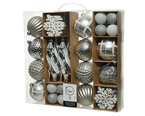 50-delige set kerstboomversieringen – kerstballen, sneeuwvlokken & eindstukken – verkrijgbaar in rood, goud en zilver (zilver)