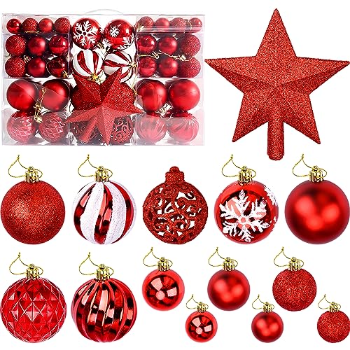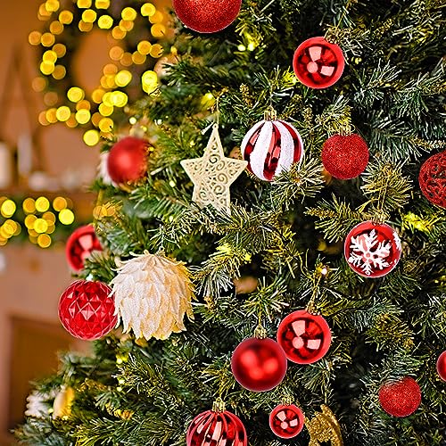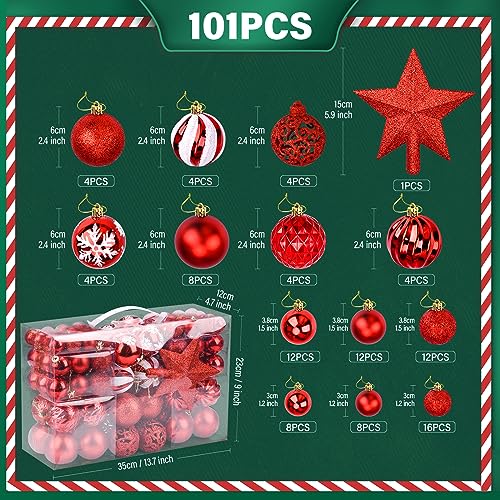 AOKITO Kerstballenset, 100 kunststof ballen in rood, mat, glanzend en glinsterend, met piek, ster, herbruikbare kerstversiering