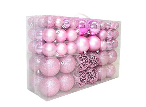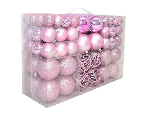 Hier koop je 100 roze en oudroze kerstballen in een doos.