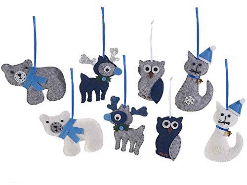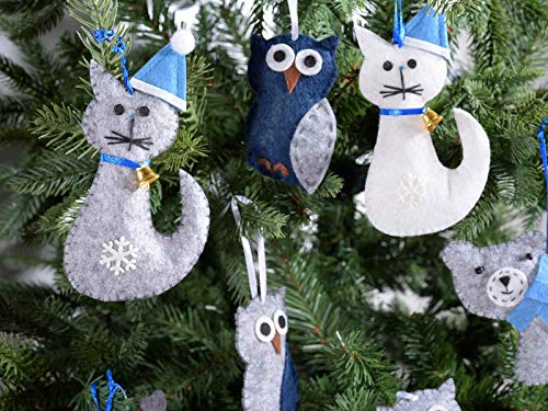Kerstboomballen in dierenvorm van gevoerde stof.