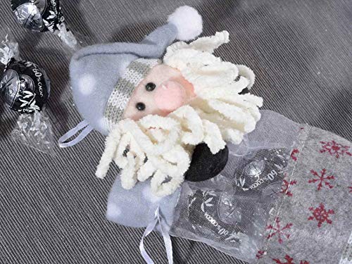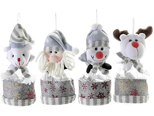 Kerstdecoratie om op te hangen in de vorm van een snoepzakje met decoratief pluche. 12 stuks gesorteerd in 4 verschillende uitvoeringen precies zoals afgebeeld. Voor decoratie van de kerstboom of als aanvulling op geschenkverpakkingen. Elke decoratie meet 8,5 x 19 cm, hoogte met koord 21,5 cm.