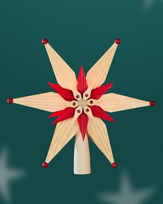 Plaats het doekje op de “I” of de kerstboom op de kerstboom. Maak meer van je kerstboom. Deze mooie kerstboompiek heeft een afmeting van 28 cm, is volledig gemaakt van lindehout. en kan met de opname aan de onderkant op de punt van de boom worden gestoken. In het midden heeft hij een naaf, met een elektrische verlichting, waarmee je een kleine rode en een grote 6-hoekige houten sterren met de ster.