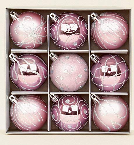 Set van 9 Pale Dusky Roze & Zilver Kerstboom Bellen; Elk is iets anders; Glitter afwerking – 4 Zilver met zilveren afwerking & 5 roze met zilveren afwerking; Elke decoratie afmetingen: 60mm x 60mm x 60mm; Shatterproof